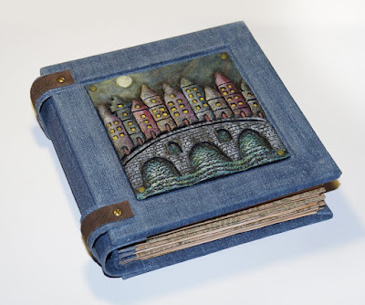 Обложка альбома обтянута джинсовой тканью, пропитанной текстурной пастой. Панно на сделано из запекаемой пластики "Сонет" и раскрашено акриловыми красками.